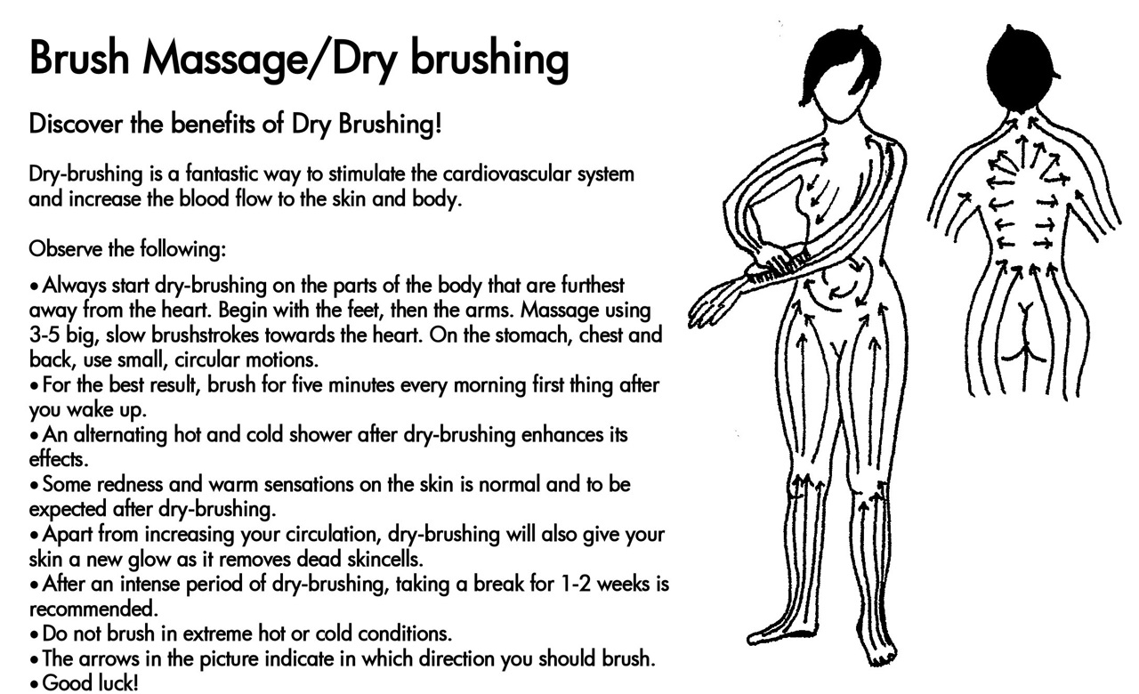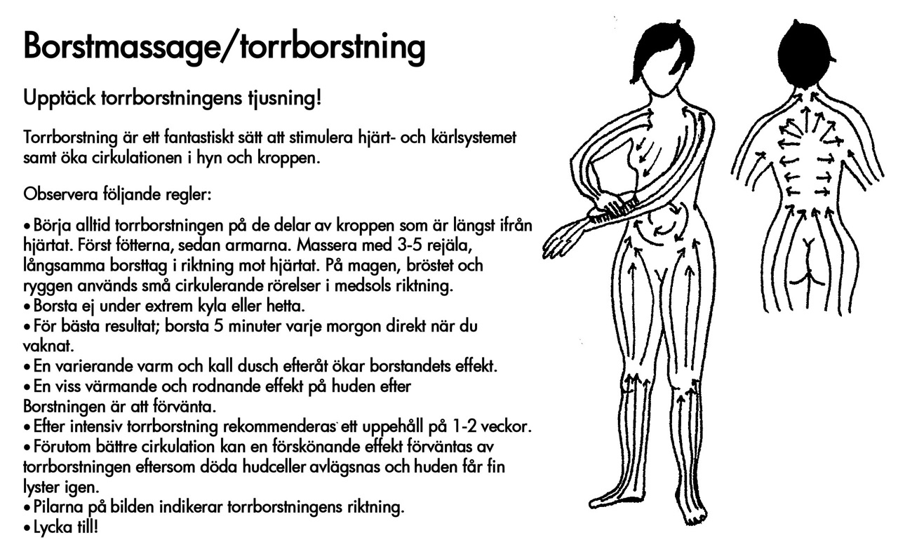 Det finns olika metoder för torrborstning och vi har här valt att illustrera en av dem. Vi rekommenderar att du berikar dig i ämnet för att hitta den metoden som passar dig bäst. Borsten ska som det låter alltid användas torr. Det är viktigt att välja en borste som känns lagom hård mot huden. I början kan det kännas lite men det går snabbt över allt eftersom huden vänjer sig.